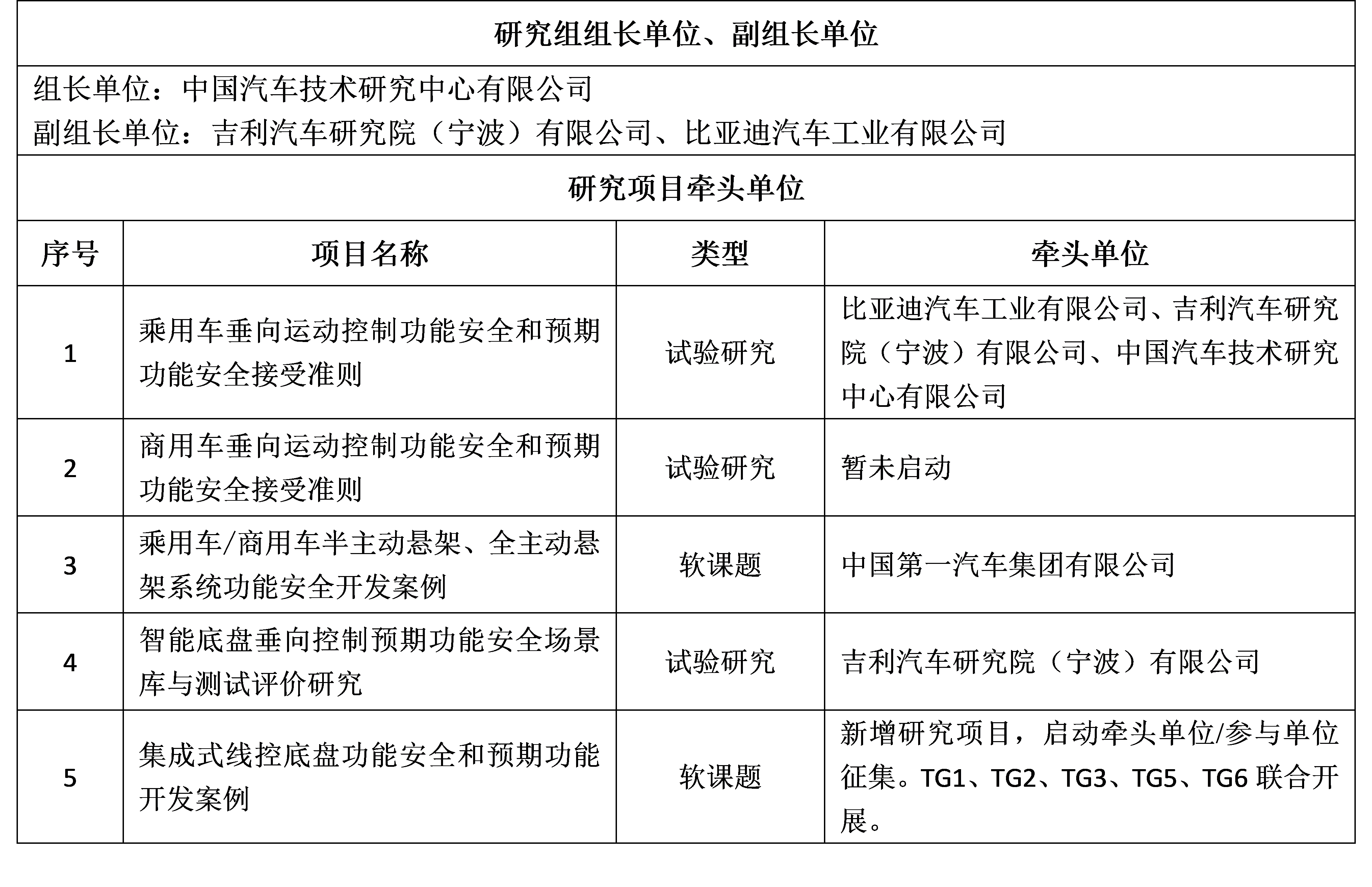 TG3-车辆行为安全接受准则研究组(垂向)的主要研究目标:基于GB/T 34590《道路车辆 功能安全》、GB/T 43267《道路车辆 预期功能安全》给出的方法论,针对半主动悬架、全主动悬架等垂向运动控制相关系统和功能,研究其功能异常行为与车辆参数及安全接受准则间的关系,识别典型危害行为、场景,建立适用于新能源汽车、智能网联汽车、传统汽车的车辆垂向运动行为安全接受准则(如可控性、信心度等量化指标)和测评方法,开发车辆垂向运动控制系统典型安全架构及方案。