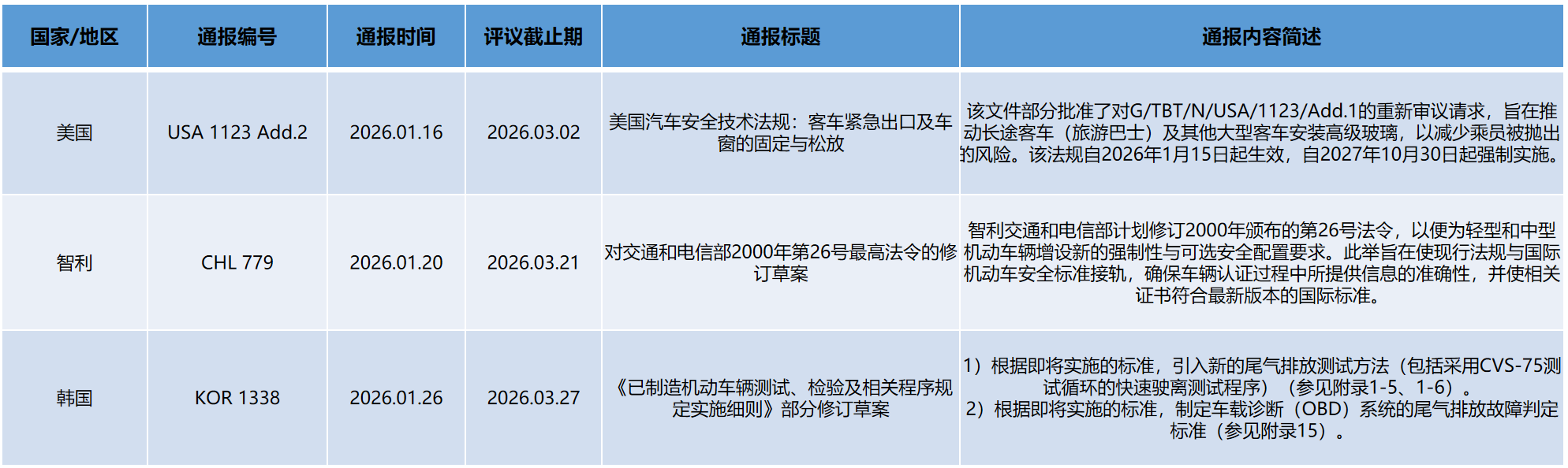 2026年1月19日至2026年1月30日期间,共有3个WTO成员通报3项汽车相关技术性贸易措施,涉及客车紧急出口、强制性准入程序、排放。通报详情如表所示。